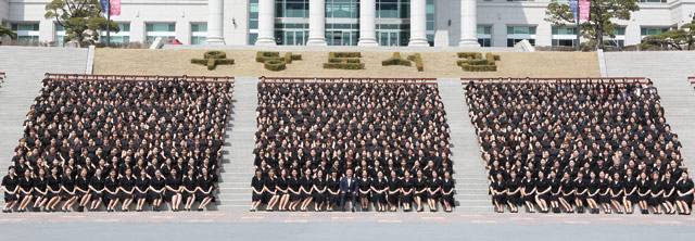 지난 4월 2일 경기도 남양주시 경복대학교에서 열린 약손명가 2017년 시무식에는 800명 전 직원이 참석했다. 경복대에는 2011년 10월에 약손명가 학과가 개설돼 대부분의 졸업생이 약손명가에 취업한다. <사진 : 약손명가>