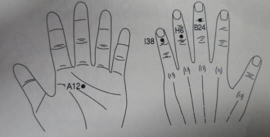 이때 따뜻한 물을 조금씩 마시면서 원형 테이프에 똑딱단추(돌출) 침이 드러난 압봉을 <위 그림> 표시 부위에 붙이고 약간 아프게 눌러주면 얼마 안 가서 점차적으로 체증이 해소된다. 볼펜처럼 생긴 침봉을 이용해 자극해줘도 좋다. 그냥 뾰족한 것이나 반대 손가락으로 세게 눌러도 상당한 효과가 생긴다.