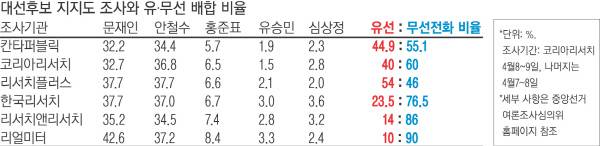 유선전화 비율이 40%인 코리아리서치와 44.9%인 지난 7~8일 칸타퍼블릭 조사에서는 안 후보가 오차범위 내에서 문 후보에 앞섰다. 무선전화 비율이 90%인 리얼미터와 86%인 리서치앤리서치 조사에서는 문 후보가 우위였다.