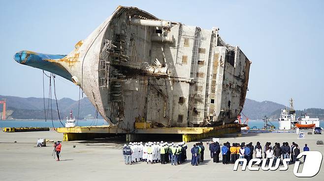 세월호 수습본부에 파견된 9개 부처 직원과 선체정리업체인 코리아쌀베지 작업자 등이 12일 오전 전남 목포신항에서 희생자를 기리는 묵념의 시간을 갖고 미수습자 수색을 위한 구체적인 작업 설계에 돌입했다. (해양수산부 제공) 2017.4.12/뉴스1