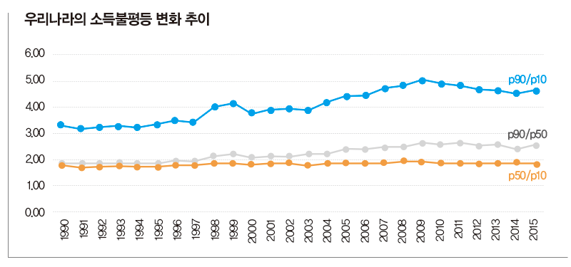 이처럼 하위 50% 내의 격차가 확대됨으로써 전체 인구의 소득불평등이 증가하는 것은 다른 OECD 회원국과 구별되는 한국의 특징이다. 올해 초 타계한 앤서니 앳킨슨 전 런던정경대 교수의 연구에 따르면 미국은 1990년대 초반 이후 P50/P10에 거의 변화가 없거나 오히려 줄어든 반면, P90/P50은 커졌다. 미국의 소득불평등 증가는 상위 50% 내에서의 격차 확대인 셈이다.