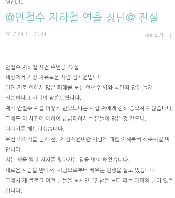 안철수 지하철 사건 주인공 22살 세상에서 가장 자유로운 사람 심재윤입니다.일단 저로 인해서 많은 피해를 보신 안철수 씨와 국민의 당분 들게 죄송하다고 사과의 말씀드립니다. 제가 안철수 씨를 어떻게 만났느냐는 사실 저에게 전혀 중요하지 않습니다.그래도 이 사건에 대하여 궁금해하시는 분들이 많은 것 같으니,이야기를 해드리겠습니다.우선 이야기를 듣기 전, 저 심재윤이란 사람에 대한 이해부터 해주시길 바랍니다. 저는 책을 읽고 저자를 찾아가는 일을 많이 해왔습니다. 새로운 사람을 만나서, 사람으로부터 배우는 인생을 살고 있습니다.그래서 제 블로그 이전 글들을 보시면, '만남을 보다'라는 테마의 글이 있을 겁니다. 그렇게 안철수씨를 만나러 가기 전날 버스에서 우연치 않게 앞자리의 사람이 통화하는 걸 들었습니다.내일 안철수씨가 이른 아침에 지하철 행보를 한다는 말을 들었습니다. 그래서 그 한마디를 듣고 한번 도박을 해보기로 했습니다인터넷에 안철수 집이라고 검색을 하면, 연관 검색어에 수락산 늘 푸른 아파트라는 검색어가 나옵니다. 그래서 저는 수락산역에서 지하철을 탈 것이라고 예상을 하였고, 지하철 시간대는 7시 이후에는 사람이 너무 많으니, 지하철 첫차 시간부터 7시까지만 수락산역에서 기다려 보기로 했습니다.그래서 저는 지하철 첫차가 대부분 5시 30분이기 때문에, 5시 30분부터 수락산역 지하철 개찰구에서 한 시간이라는 시간 동안 기다리는 도중, 경호원들 사이에서 내려오는 안철수 씨를 보게 되었습니다.그리고 지하철 개찰구 앞에서 페이스북 라이브를 허락을 맡았고, 개찰구에서부터 지하철 안까지, 같이 탑승하였고 처음 안철수 씨 옆 두 자리는 비어있었고, 저는 그저 그 옆에 앉아서 다시 라이브를 시작하였습니다.그리고 '최고의 설득'이라는 책을 준 것에 대한 의문 풀어드리겠습니다. 저도 아직 반밖에 읽지 못해서, 솔직히 더 읽고 싶은 책이었습니다. 그런데, 대통령 후보로 나왔고, 말 한마디 한마디가 중요하기 때문에 최고의 설득이라는 책은 세계 정상들의 스피치라는 부제가 달려있어 드리면 도움이 될까 싶어서, 저도 다 읽지 못한 책을 드렸습니다.이것으로 지하철 안철수 연출 사건은 연출이 아닌 그저 우연의 사건이었고, 저는 섭외된 사람이 아니라는 곳일뿐더러 저는 안철수의 열렬한 지지자가 아니고, 그저 사람에 관심이 많고, 사람에게 배우는 것을 좋아하는 청년이라고 말씀드리고 싶습니다.제가 이번 지하철을 사건을 통해서 객관적으로 본 안철수 씨 (대통령 선거 후보로 본 것이 아닌 사람)는 제 질문에 답변을 해주실 때 말 한마디 한마디에 진실성이 드러났고 답변이 길어질게 걱정돼 추슬러서 간결하게 말해주셨고 말에 솔직함이 담겨있었다고 봅니다.정치를 하시는 분이어서 전부를 신뢰를 못하지만 그래도 제가 객관적으로 본 사람 안철수는 저렇게 보았습니다.이 사건으로 인해 저도 피해를 보았고 제 주위 사람들이 피해를 보았습니다. 앞으로도 이런 수많은 기사들이 나오고 수많은 허위 사실들이 유포되겠지만 이 글을 읽으시는 분들만이라도 기사에 대해 객관적인 눈을 갖고 보셨으면 하는 22살 젊은 청년이 드리는 바램입니다.긴 글 읽어주셔서 감사합니다.모두 후회 없는 하루하루 사시길 바라겠습니다감사합니다.