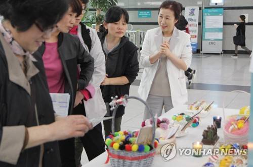 (대전=연합뉴스) 13일 대전 서구 을지대학교병원 1층 로비에서 내원객이 '부활절 맞이 달걀 꾸미기 콘테스트'에 출품된 작품을 살피고 있다. 기독교 신자 모임 신우회는 입원 환자에게 예수 부활을 기념하는 달걀 1천여개를 전달했다. 2017.4.13 [을지대병원 제공=연합뉴스]