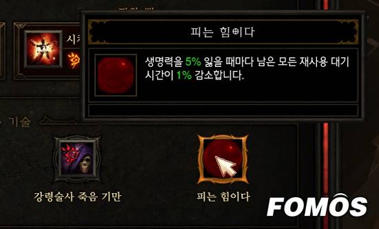 또, 지속 기술에 있는 '피는 힘이다'의 경우 강령술사의 HP가 소모될 때마다 모든 기술의 재사용 대기시간을 1%씩 감소시켜주기에 HP를 소모해 사용하는 기술과 조합하면 강력한 보조 기술을 계속해서 빠르게 사용할 수 있다.