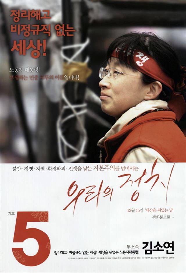 하지만 두 공룡 후보의 접전 아래 숨겨진 주인공이 있었다. 바로 ‘노동자 대통령’이라는 구호를 내세워 출마한 기호 5번 김소연(득표율 0.05%), 기호 7번 김순자 무소속 후보(득표율 0.15%)다. 노동자 출신인 두 후보의 철학은 포스터에도 묻어난다. 우선 여타 선거 벽보에 비해서 두 후보의 포스터는 얼굴이 차지하는 비중이 적다. 김소연 후보는 심지어 머리에 투쟁 띠를 두른 모습으로 등장한다. 중도 사퇴 없이 대선 레이스를 완주한 두 사람은 작지만 강한 힘을 세상에 알렸다.