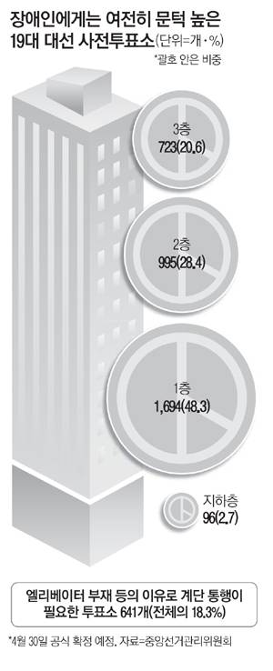 중앙선관위에 따르면 이번 대선 사전 투표소 3508개소 중 1층에 설치되는 곳은 1695개소(48.3%)로 50%를 밑돌 전망이다. 지하나 2층 이상에 있으면서 계단밖에 없는 투표소도 18.3%인 641개소나 된다.