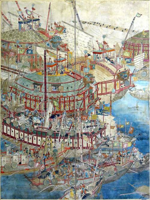 | 300∼350년 전의 것으로 추정되는 거북선 고서화. 거북선으로 보이는 군선 4척과 배 위에서 회의 중인 장수, 병사들의 모습을 사실적으로 묘사하고 있다. 세계일보 자료사진 |