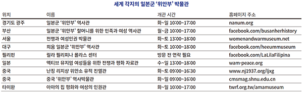 박물관을 만들거나 전시 자료를 만들기 힘든 지역은 기존 박물관의 협력을 얻고 있다. 동티모르에서 ‘위안부’ 문제 해결 운동과 생존자 지원 활동을 하고 있는 동티모르인권협회(HAK Association)는 2008년 2월부터 왐의 특별전 <동티모르 전쟁 속에 살아남은 여성들~일본군과 인도네시아의 지배하에서(2006~2007년)>를 국민의 대다수가 사용하는 테툼어로 번역해서 순회 전시를 하고 있다. 식민지 종주국의 포르투갈어나 2002년까지 24년간 침략 통치를 한 인도네시아어가 아닌 자신들의 언어로 ‘위안부’ 역사를 가르치기 위해서다. 박물관 운동이기에 가능한 연대다. 앞으로 이어질 박물관 간의 교류 협력은 민족과 국가를 초월해 각 지역의 일본군 ‘위안부’ 역사의 깊이를 더해갈 것이다.