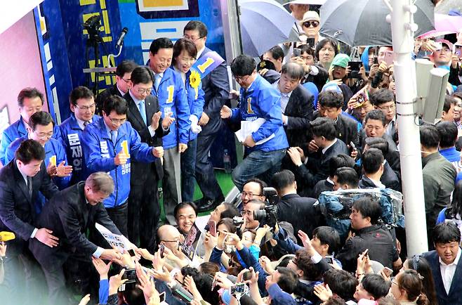 | ▲ 더불어민주당 문재인 대선후보가 22일 오후 창원 상남동 분수광장에서 유세를 하기 위해 연단에 오르자 많은 사람들이 손을 내밀어 잡으려 하고 있다. |