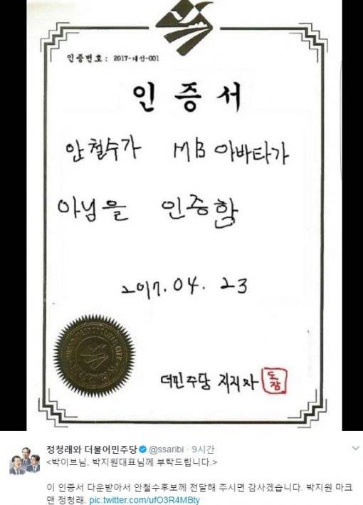 그는 이어 <안철수가 MB 아바타가 아님을 인증함-더민주당 지지자->라고 적힌 인증서 이미지를 만들어 첨부하며 "박이브님, 박지원대표님께 부탁드립니다. 이 인증서 다운받아서 안철수후보께 전달해 주시면 감사겠습니다. 박지원 마크맨 정청래"라고 글을 올렸다.