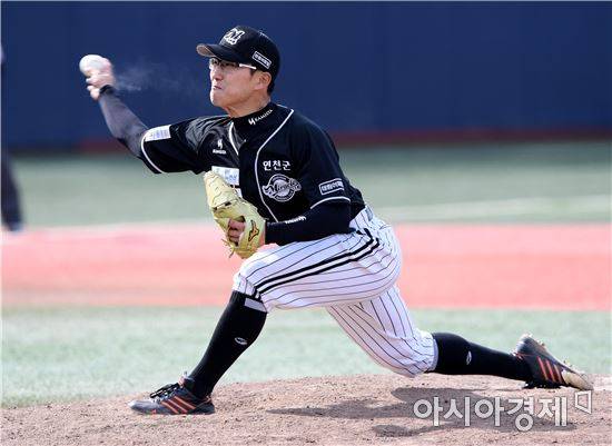 [아시아경제 김현민 기자] 연천 미라클과 저니맨 외인구단의 2017 독립야구리그 개막전이 24일 서울 목동야구장에서 열렸다. 4회말 연천 황건주가 역투하고 있다.