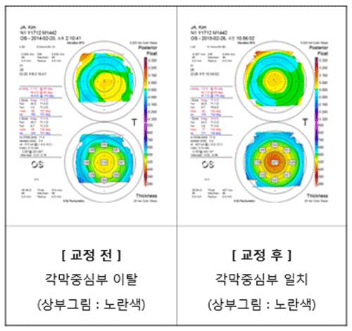 마침내, 이런 안과적 난제를 해결한 신기술이 국내 연구진에 의해 세계 최초로 개발되었다. 발명된 기술은 각막형태교정술이다. 특징은 각막의 형태를 유지시켜 주는 눈 속의 압력을 활용해 각막의 형태를 교정하고 곡률편차를 줄여 각막 내면의 시선 축을 중심으로 곡률이 대칭이 되도록 만들어 줌으로써, 눈으로 들어와 수정체를 통과하는 빛의 경로 이탈이 없어 시축을 중심으로 초점이 선명히 맺도록 만들어 준다.
