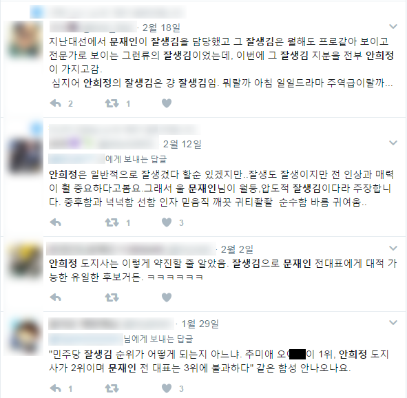 다만 이번 민주당 경선에서 우스개소리로 '최고 잘생김을 놓고 안희정 도지사와 문재인 전 대표가 대결한다'는 농담도 나왔었다. 네티즌들은 각 후보의 멋진 사진을 SNS에 올리며 각자의 주장을 내놓거나 온라인 특유의 웃음을 유발했다.