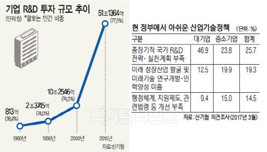 민간 기업의 연구개발(R&D) 역량이 성장하는 데도 정부의 정책적 지원이 결정적인 역할을 했다. 1980년대 정부가 핵심 전략기술 개발에 초점을 맞춘 '기술 드라이브' 정책을 펼치면서 1981년 53개에 불과했던 기업 부설연구소는 1991년 1000개를 돌파했고, 이들이 국가 총 연구개발비에서 차지하는 비중은 1982년 50%를 기록한 데 이어 1990년 80.6%에 달했다.