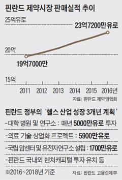 핀란드 경기가 수년째 침체에 빠져 있음에도 불구하고, 제약·헬스 산업은 꾸준히 성장해왔다. 핀란드 고용경제부에 따르면 의료 기술과 디지털 헬스 및 관련 서비스 산업 규모가 50억유로(6조800억원)로 핀란드 국내총생산(GDP)의 2.5%를 차지하고 있다. 제약시장 판매 실적은 2015년 22억8300만유로(2조7700억원)에서 2016년 23억7200만유로(2조8800억원)로 3.8% 늘었다. 2010년 이후 6년째 성장세다. 지난해 제약 연구개발(R&D) 투자액도 전년 대비 3.2% 확대됐다. 유시 메리칼리오 제약업협회장은 "제약 산업 발전이 일자리와 정부 세수(稅收)를 늘려 핀란드 경제 성장에 기여하고 있다"고 밝혔다.