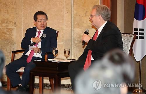'홍트럼프'라는 별명을 가진 홍 후보는 간담회에서 도널드 트럼프 미국 대통령과 비교해달라는 질문에 "트럼프 대통령은 저보다 무지막지하다"면서 "상당히 과단성 있는 지도자이고 저는 한국식으로 문제를 풀어가려고 하기 때문에 조금 다른 측면이 있지만 일을 밀어붙이는 측면에서는 비슷하지 않나 생각한다"고 자평했다.
