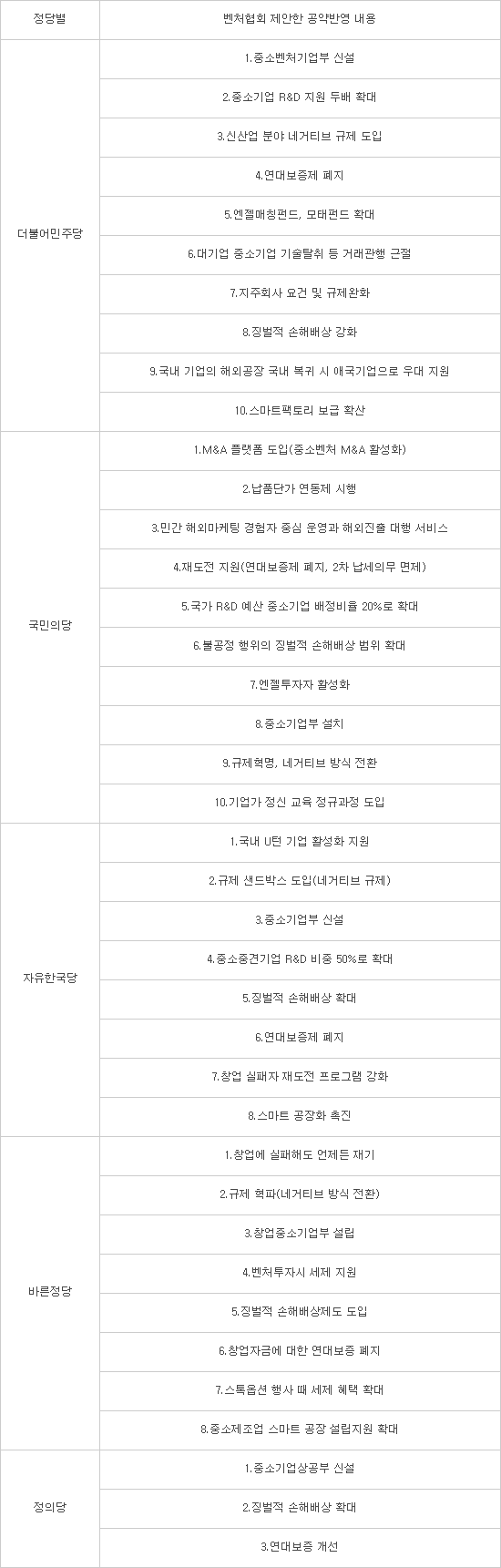 공약과제에 따르면 협회는 벤처생태계 5대 핵심과제로 △M&A로 열악한 회수환경 개선 △시장논리 중심 벤처투자로 전환 △성실실패자에게 원칙적 재도전 기회 제공 △창업규제 근본 해결책, '규제 샌드박스 제도' 도입 △상생의 열쇠, 기울어진 운동장 바로잡기를 선정했다.