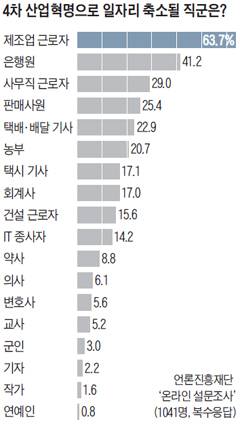 국민 76.5% "4차 산업혁명, 내 일자리 위협".. 생산직 근로자·은행원·사무직順 타격 전망