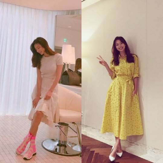 봄이 왔음을 만끽할 수 있는 컬러를 두 가지 꼽자면 핑크와 옐로. 사진 속 박수진은 심플한 원피스 룩에 핑크와 옐로 포인트를 주어 패셔너블한 감각을 뽐냈다. 심플한 화이트 레이스 원피스에는 사랑스러운 핑크X베이지 니트 부티 스니커즈로 사랑스러움을 더했다.