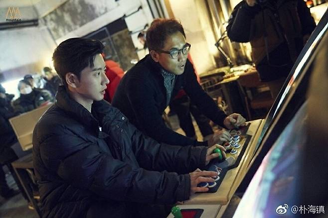 사진에는 박해진과 '맨투맨' 감독이 게임 대결을 하고 있는 모습이 담겨 있다.