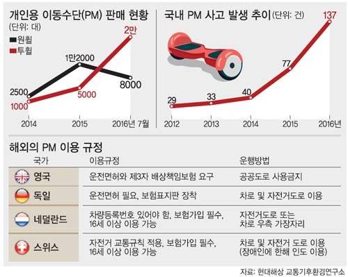 판매량도 크게 늘었다. 현대해상 교통기후연구소에 따르면 국내 PM 판매량은 바퀴가 1개인 ‘원휠’ 제품이 2014년 2500대에서 지난해 7월 기준 8000대로 증가했다. 바퀴가 2개인 ‘투휠’ 제품 판매량은 같은 기간 1000대에서 2만대로 20배 급증했다. 관련 사고도 매년 늘어 2012년 29건에 불과했던 것이 2015년 77건, 2016년 137건을 기록했다.