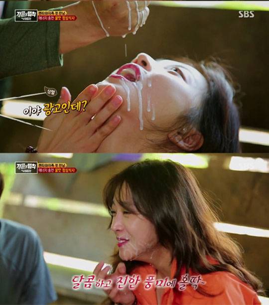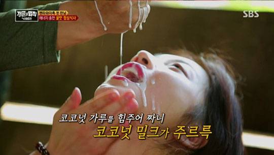 김병만은 조보아에게 코코넛 가루를 짠 코코넛 밀크를 권했고, 조보아는 흔쾌히 입을 벌리고 받아 먹었다.