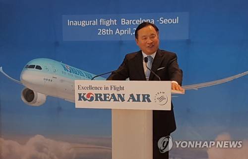 (바르셀로나=연합뉴스) 인천공항과 스페인 바르셀로나를 연결하는 직항 노선이 처음 개설됐다. 대한항공은 인천-바르셀로나 노선에 248석인 B777를 투입해 주 3회 운항할 예정이다. 사진은 지난 28일 저녁 바르셀로나 엘프라트 국제공항에서 열린 인천-바르셀로나 직항개설 기념행사에서 축사하는 박희권 주스페인 대사. 2017.4.30 [주스페인한국대사관 제공=연합뉴스]
