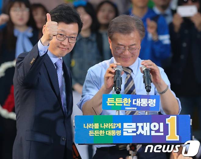 (서울=뉴스1) 허경 기자 = 30일 서울 서대문구 신촌로에서 열린 문재인 더불어민주당 대선 후보의 집중유세에서 김경수 대변인이 엄지손가락을 치켜세우고 있다. 2017.4.30/뉴스1