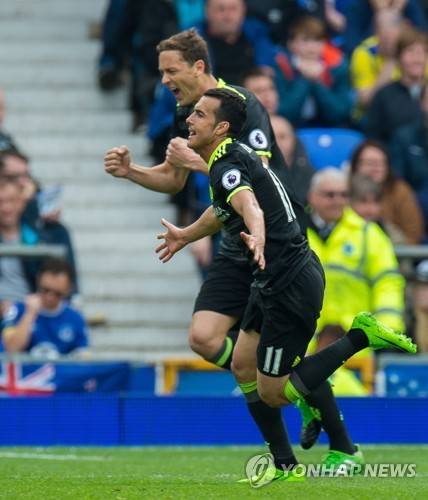 epa05937141 Chelsea's Pedro celebrates scoring the opening goal during the English Premier League soccer match between Everton and Chelsea held at Goodison Park, Liverpool, Britain, 30 April 2017. EPA/PETER POWELL EDITORIAL USE ONLY. No use with unauthorized audio, video, data, fixture lists, club/league logos or 'live' services. Online in-match use limited to 75 images, no video emulation. No use in betting, games or single club/league/player publications