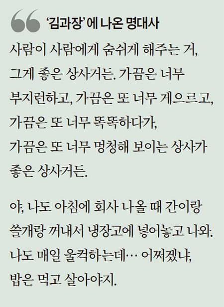 추 부장의 눈물 나는 대사들도 김원해의 경험이 있었기에 가능했다. ‘나도 한때 여기 A4 용지처럼 스치면 손끝 베일만큼 날카롭고 빳빳하던 시절이 있었어’로 시작하는 명대사도 김원해의 애드립이었다.