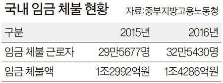 이 때문에 근로기준법에 따라 구속되는 사례도 나온다. 대전지방고용노동청은 지난 2월 근로자 39명의 임금 6000여만원을 체불하고 도주한 D씨(49)를 근로기준법 위반 혐의로 구속했다. 휴대전화 대리점 등을 운영하던 D씨는 수입금을 유용하곤 했는데 임금 지급을 요구하는 근로자들에게 “월급 대신 차라리 벌금을 내는 게 더 낫다”고 말한 것으로 드러났다.