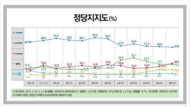 정당 지지도는 더불어민주당이 39.8%, 자유한국당이 18.9%, 국민의당이 17.4%, 정의당이 10.6%, 바른정당이 5.7%를 기록했다. 지지정당 없음/기타 의견은 6.5%였다. 자유한국당은 전주보다 4.0%포인트 상승했고, 국민의당은 전주보다 0.3%포인트 하락해 정당 지지율 순위 2위와 3위가 뒤바뀌었다.