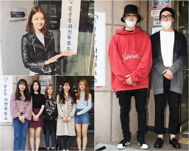 또 걸그룹 다이아의 정채연과 갓세븐 멤버 진영, JB도 청담동 주민센터에서 아침 일찍 사전 투표를 마쳤다. 전민주와 이수현의 합류로 데뷔를 앞두고 있는 걸그룹 데이데이도 마쳤다. 아이돌 스타들의 경우 해외 일정 등으로 인해 오는 9일 투표에 참여하지 못해 미리 사전 투표를 하는 경우가 많다. 이들 역시 SNS를 통해 인증하며 투표의 중요성에 대해 알리고 참여를 독려하는 모습이다.