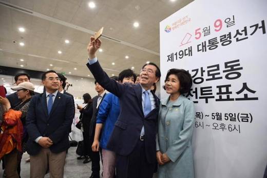 | 투표 인증샷. 사전투표 인증샷. 박원순 서울시장(사진 찍는 이)이 오늘(4일) 서울 용산구 용산역 한강로동 사전투표소에서 부인 강난희씨와 사전투표를 하고 인증샷을 찍고 있다. /사진=박원순 페이스북 |