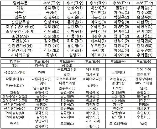 [공식] 53회 백상 심사표 공개..TV 대상 김은숙 5표, 영화 대상 박찬욱 3표