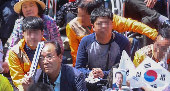 | ▲ 자유한국당 홍준표 후보의 유세가 펼쳐진 4일 오전 경북 안동 중앙로에서 지적장애인들(사진 내 모자이크 처리)이 인솔자와 함께 홍 후보 유세에 참석하고 있다. 이 지적장애인들이 속한 시설은 자유한국당 안동 선대위에 소속 되어있는 김 아무개씨가 센터장으로 있으며 이들은 유세가 끝난 직후 사전투표장으로 가 투표를 했다. |