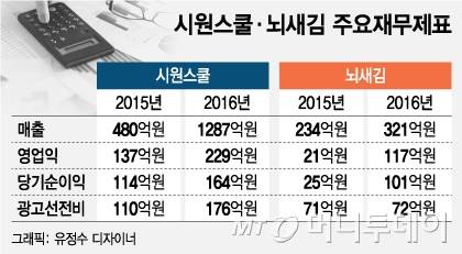 실제로 시원스쿨과 뇌새김의 지난해 매출액 대비 광고선전비 비율은 각각 13.7%와 22.4%로 파악됐다. 이는 국내 1위 수능 교육업체 이투스교육(8.2%)과 연매출 3000억원 규모의 에스티유니타스(6.4%)보다 높은 수치다.