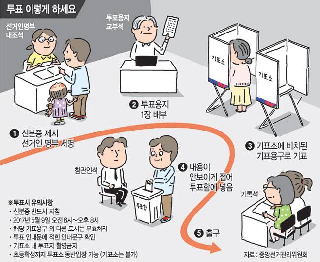 세부 절차를 살펴보면 유권자는 가장 먼저 자신의 주소지 관할 투표소를 방문, 신분증을 제시하고 선거인 명부에 서명한다. 이때 자신의 선거인 명부 등재번호를 미리 알아두면 명부에서 본인의 이름을 빨리 찾아 시간을 아낄 수 있다. 등재번호는 각 가정에 배달된 ‘제19대 대통령선거 투표안내문’과 전국 시·군·구 및 중앙선거관리위원회 홈페이지 등에서 확인할 수 있다.