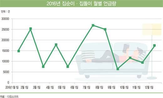 특히 지난해 ‘집순이·집돌이’에 대한 언급량을 보면 2월, 7월, 8월에 2만5000건 이상을 기록해 ‘방콕’하는 사람들의 언급이 많았다는 것을 알 수 있다.