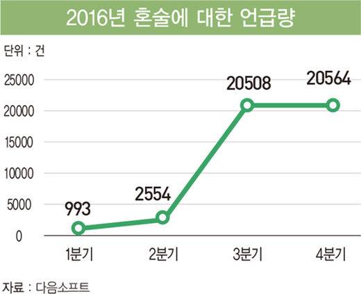 실제 ‘혼술’에 대한 언급은 2016년 1분기 993건, 2분기 2554건, 3분기 2만508건, 4분기 2만564건으로 2016년 3분기에 급증한 후 높은 언급량을 유지하고 있다.