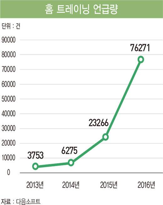 ‘홈 트레이닝’에 대한 언급량은 2013년 3753건, 2014년 6275건, 2015년 2만3266건, 2016년 7만6271건으로 2016년에 전년 대비 3.2배 증가하며 관심이 급증했다.