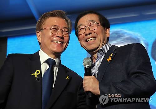 (서울=연합뉴스) 서명곤 기자 = 문재인 대통령 당선인이 10일 오전 서울 종로구 세종로공원에서 열린 시민들과 함께하는 개표방송에서 박원순 서울시장과 함께 웃음 짓고 있다. 2017.5.10
