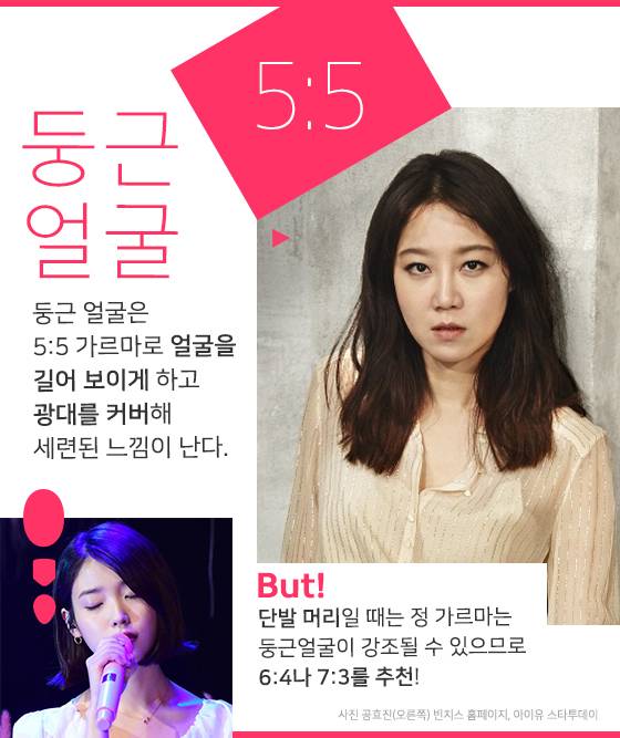 둥근 얼굴은 5:5 가르마를 하면 얼굴이 길어보이고 광대를 커버해 세련된 느낌이 난다. 하지만 단발일 때는 둥근 얼굴이 강조될 수 있으므로 6:4나 7:3을 추천한다. 하관이 발달된 각진 얼굴형은 7:3 이나 8:2 앞머리가 턱선을 덜 부각되어 보이게 한다. 턱이 뾰족한 스타일은 1:9나 2:8 가르마와 부드러운 굵은 웨이브 스타일링이 잘 어울린다.