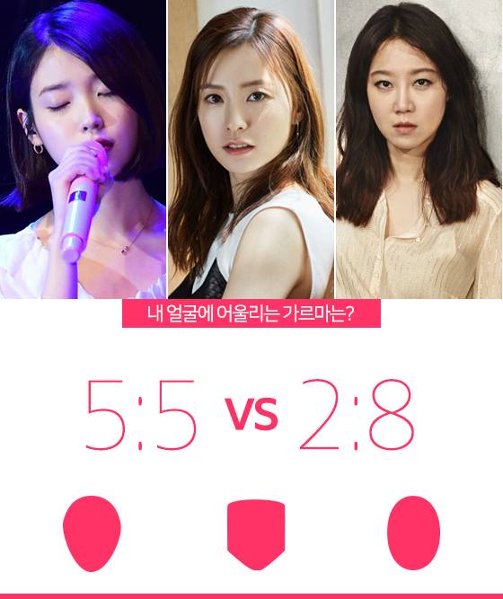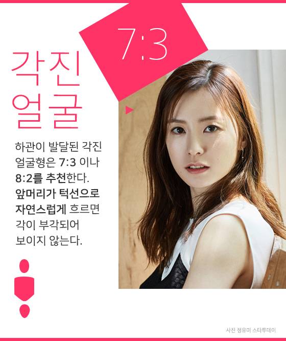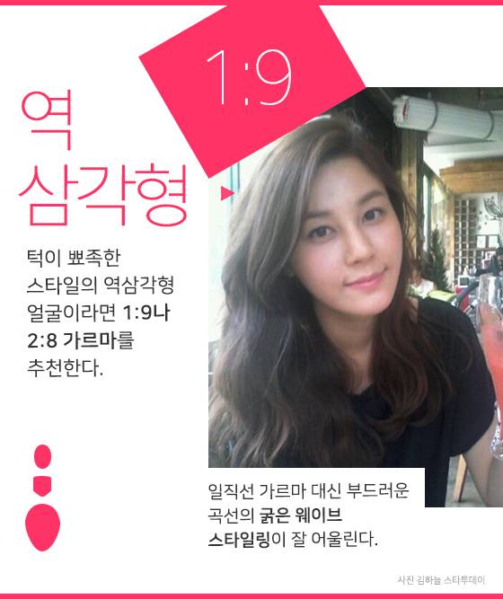 둥근 얼굴은 5:5 가르마를 하면 얼굴이 길어보이고 광대를 커버해 세련된 느낌이 난다. 하지만 단발일 때는 둥근 얼굴이 강조될 수 있으므로 6:4나 7:3을 추천한다. 하관이 발달된 각진 얼굴형은 7:3 이나 8:2 앞머리가 턱선을 덜 부각되어 보이게 한다. 턱이 뾰족한 스타일은 1:9나 2:8 가르마와 부드러운 굵은 웨이브 스타일링이 잘 어울린다.