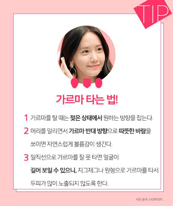 일직선으로 가르마를 잘 못 타면 얼굴이 길어 보일 수 있으니, 지그재그나 원형으로 가르마를 타서 두피가 많이 노출되지 않도록 한다.