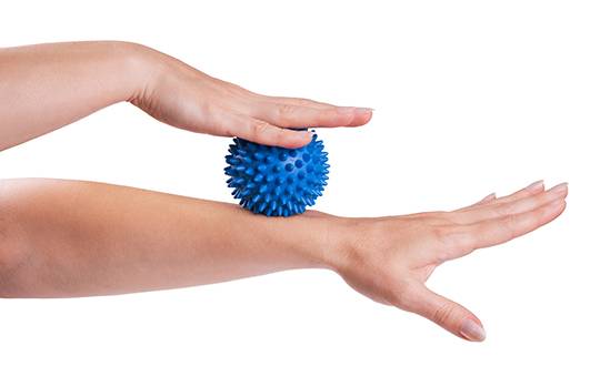손 근육들을 팔꿈치 근육으로 연결돼 있기 때문에 손 통증을 완화하려면 팔뚝 관리도 필요하다. 마사지볼을 이용해 손목과 팔꿈치 사이 팔뚝 부위를 문지르면 효과를 볼 수 있다.