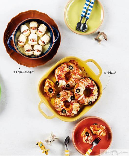 1 튀김도넛 윗면에 토마토스파게티소스를 펴 바른다. 2 블랙올리브와 프랑크소시지는 동그란 모양을 살려 자르고, 양파는 곱게 채썬다. 3 도넛 위에 ②의 토핑을 고루 올리고 모차렐라치즈를 뿌린다. 4 190℃로 예열한 오븐에 넣어 7~8분 정도 굽는다. 오븐이 없다면 전자레인지에 넣어 30초~1분간 돌린다.