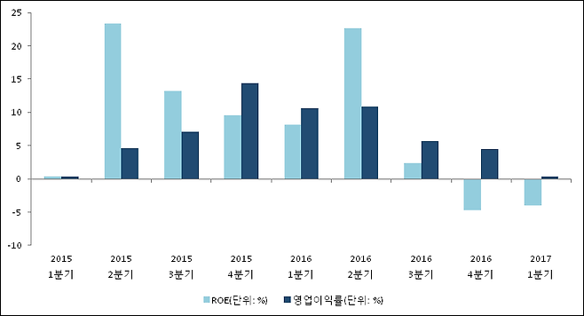 전년 동기인 2016년 1분기 ROE는 22.6%로 이번 분기에 22.2%p 하락했다.