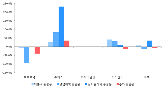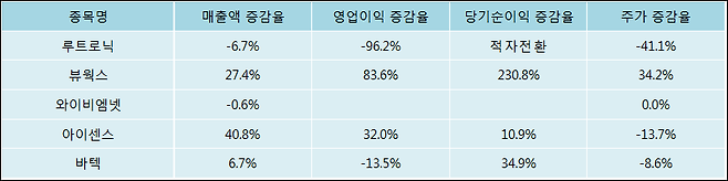 다음은 루트로닉과 동일 업종 내 비교 그룹 종목의 각각 최근 실적의 전년 동기 대비 성장률이다.