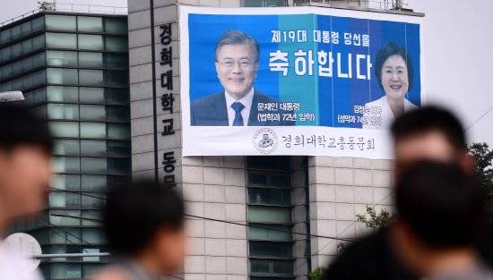 문 대통령의 임기 첫날인 지난 10일 경희대학교 서울캠퍼스 정문에는 '문재인 동문의 제19대 대통령 당선을 축하합니다'라고 적힌 현수막이 내걸렸다.